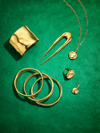 Crafted with care, this collection showcases recycled glass in vibrant shapes, accented by the luxe gleam of 24k gold plating.